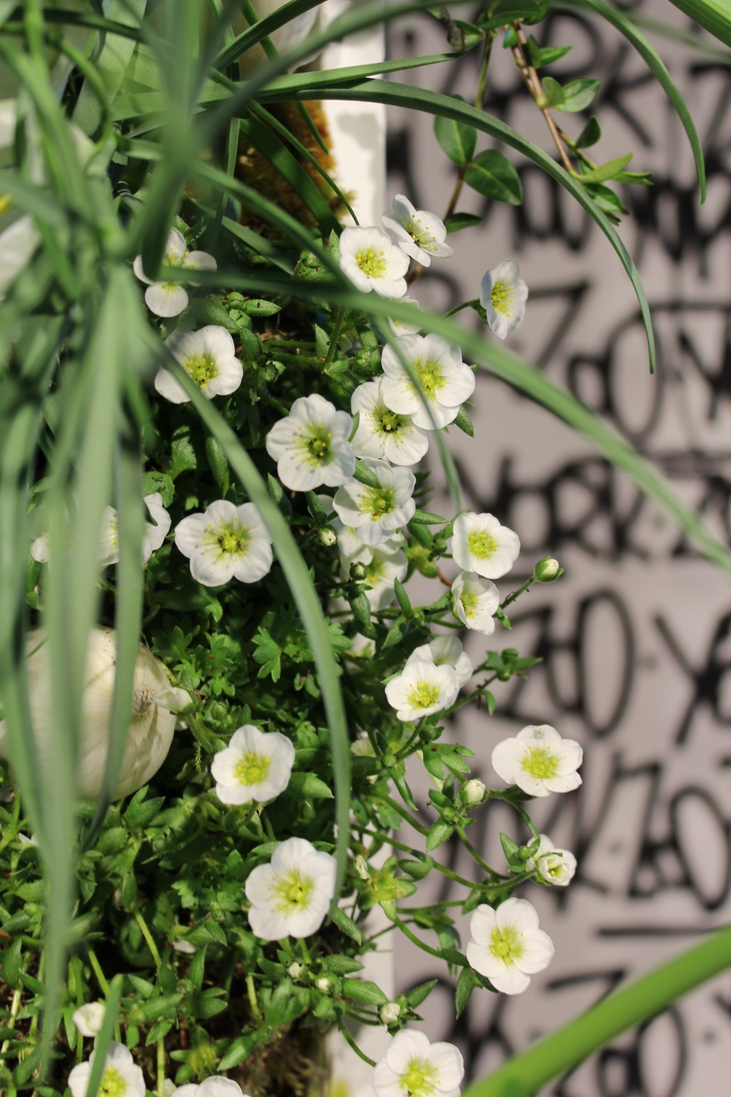 Übereinander gepflanzt wachsen die Narzissen (Narcissus), Schachbrettblumen (Fritillaria) und die Steinbrechgewächse (Saxifraga) in alle Richtungen. Gehalten von Moos und der Schwerkraft. Ein gelber Akzent der Hornveilchen (Viola) bringen die Verbindung zu den im Schaufenster stehenden Schuhen. Weiße Zwiebeln sorgen für die Bodengestaltung der Pflanzung und geben dem Auge Ruhepunkte.