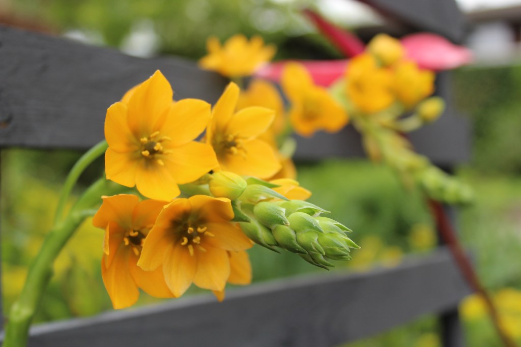 Ich entdeckte vergangene Woche alte Holzgestelle im Müllkontainer. Sie erinnerten mich an Notenlinien. Eine Idee war geboren. So beschloss ich die Farbwolken in Kandinkys Bild in der Notenlinie zu intepretieren. Verzweigte Blüten und große wirkungsvolle Formen für die Fernwirkung mussten her. Das Schleierkraut und die roten Anthurien fanden zusammen. Zusammen mit den Ornithogalum in Gelb und den Hortensien in Blau bespielten sie dann tänzerisch meine Tonleiter. Die Farben im Bild sollten sich in der Installation von mir interpretiert wiederfinden. Das Gelb und das Schwarz waren mir am wichtigsten. Eine Studienkollegin fand in den Blütenformen sogar die verschiedenen Noten wieder. Die Schleierkrautblüten wären demnach die Achtelnoten. Die großen Anthurien wären Viertelnoten. Und die Hortensie wäre eine Viertelpause. Mir gefiehl die Formverbindung zu echten Noten. Ebenso entstand durch die Aufhängung eine lässige Wirkung.