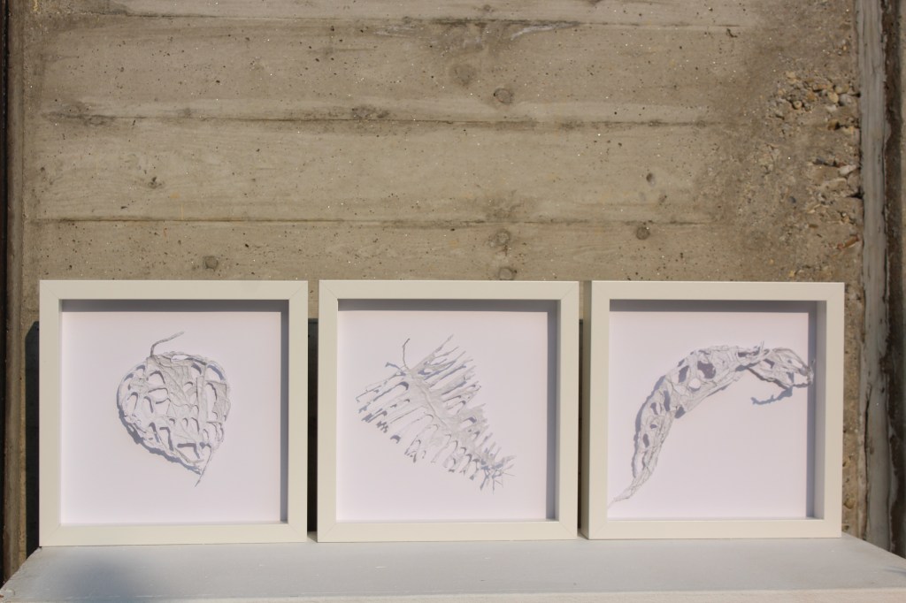 Es sind die kleinen Dinge, die meistens übersehen werden. Kunst ist ein wunderbares Medium. Sie erlaubt es mir, die für mich wichtigen Merkmale der Natur für den Betrachter sichtbar zu machen. Ordnend, ja fast gesammelt wirkt die kleine Ansammlung der weißen Papierschönheiten unter den Glaskuppeln und in den Rahmen. Ein Herbarium. Spannend ist auch die Verbindung zu knöchernen Strukturen. Mir gefällt der Interpretationskontrast. Beim ersten Hinsehen könnte man meinen könnte, es hänge ein Tierschädel im Glas.