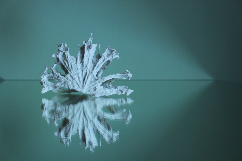 Während meines Prozesses, die Eigenschaften von Papier und Metalldraht auszureizen, näherte ich mich einer runden, räumlichen Form an. Ich wollte eine florales, blütenähnliches oder sogar fruchtähnliches Objekt interpretiert darstellen. Das Ergebnis war eine fast runde, aufgebrochene Grundform, die durch die Textur des Papierüberzugs fossil wirkte. Wie mich versteinerte Tiere zu Kunstobjekten inspirierten und ein Spiegel eine Form vollendete.